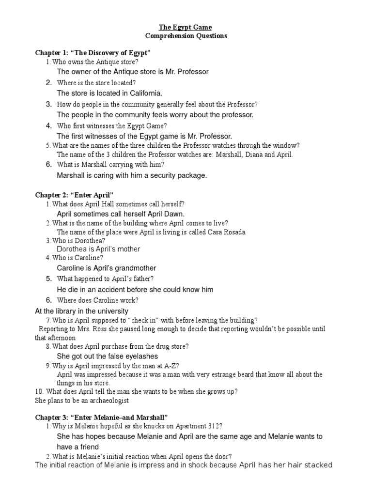 The Egypt Game Comprehension Questions And Answers Teaching Resources Tpt